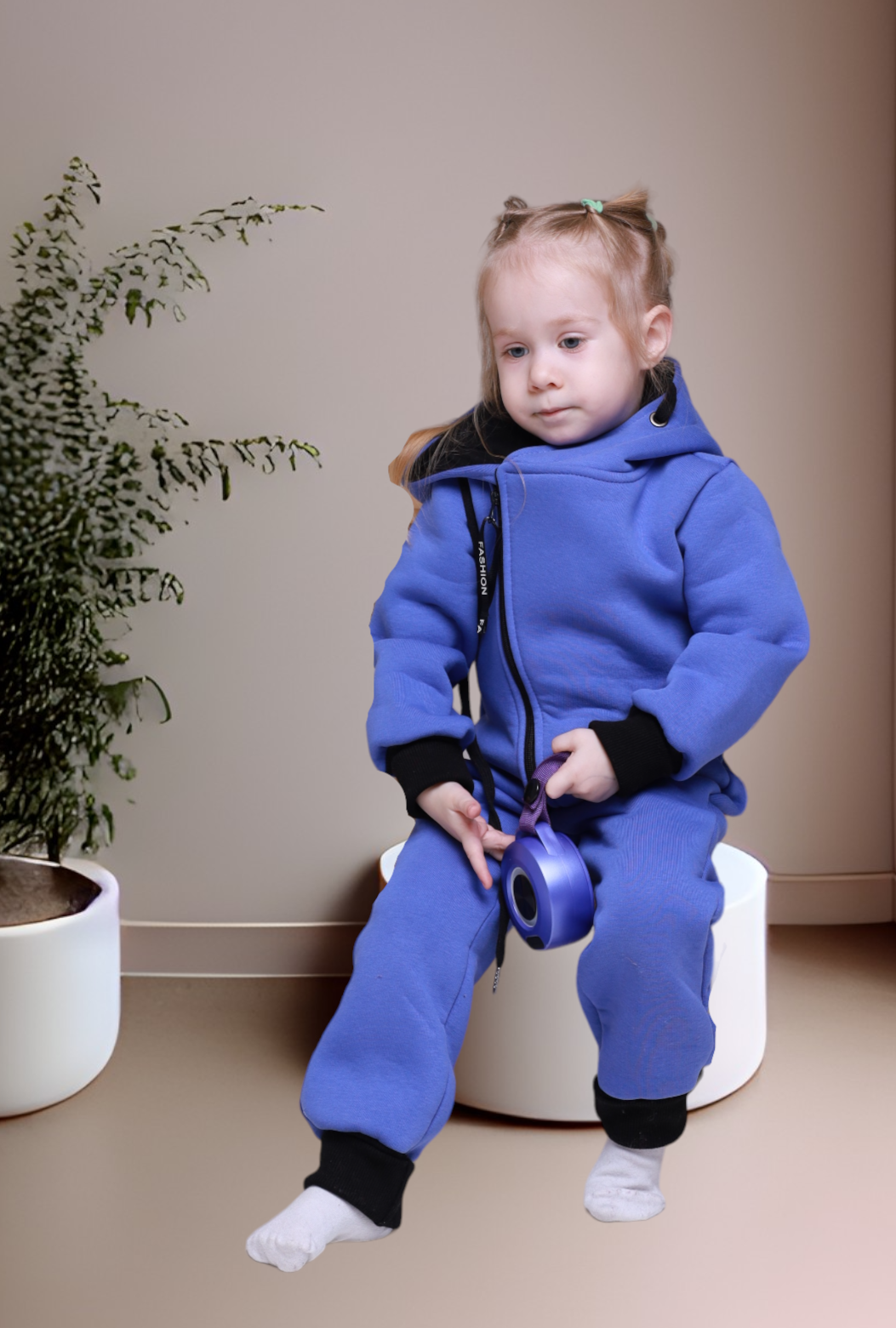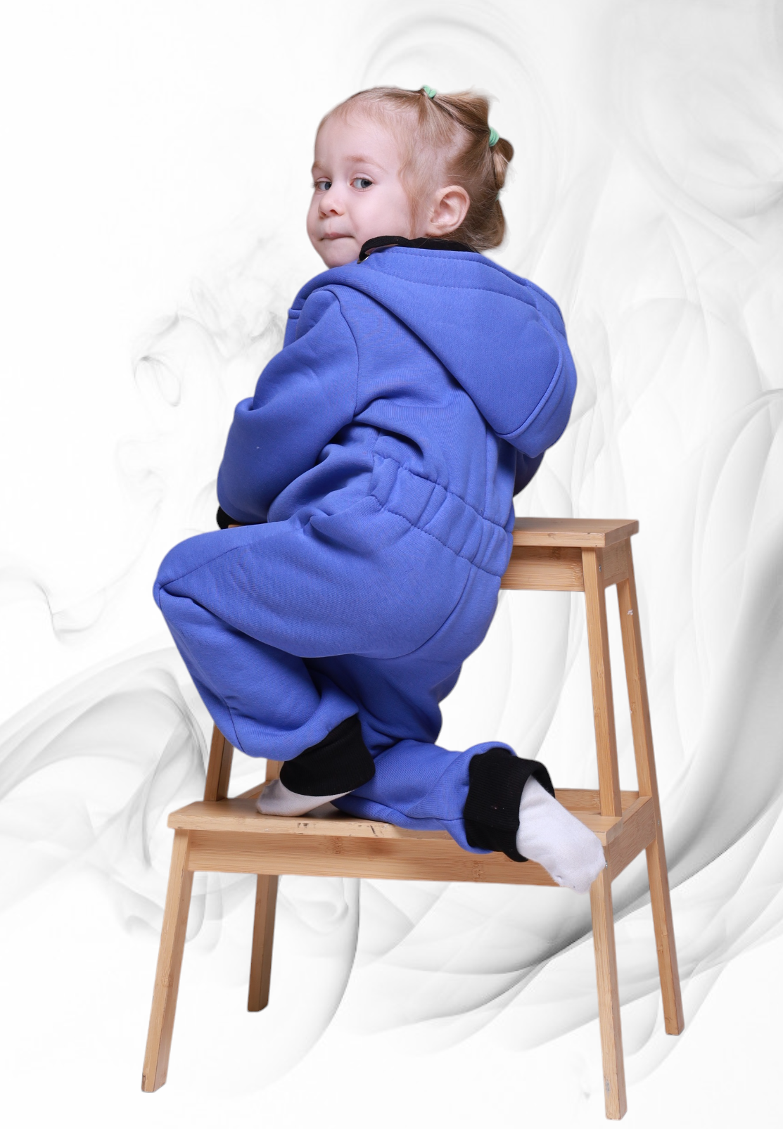 Комбинезон с капюшоном на подкладке, с открытыми ножками, спереди на косой молнии.