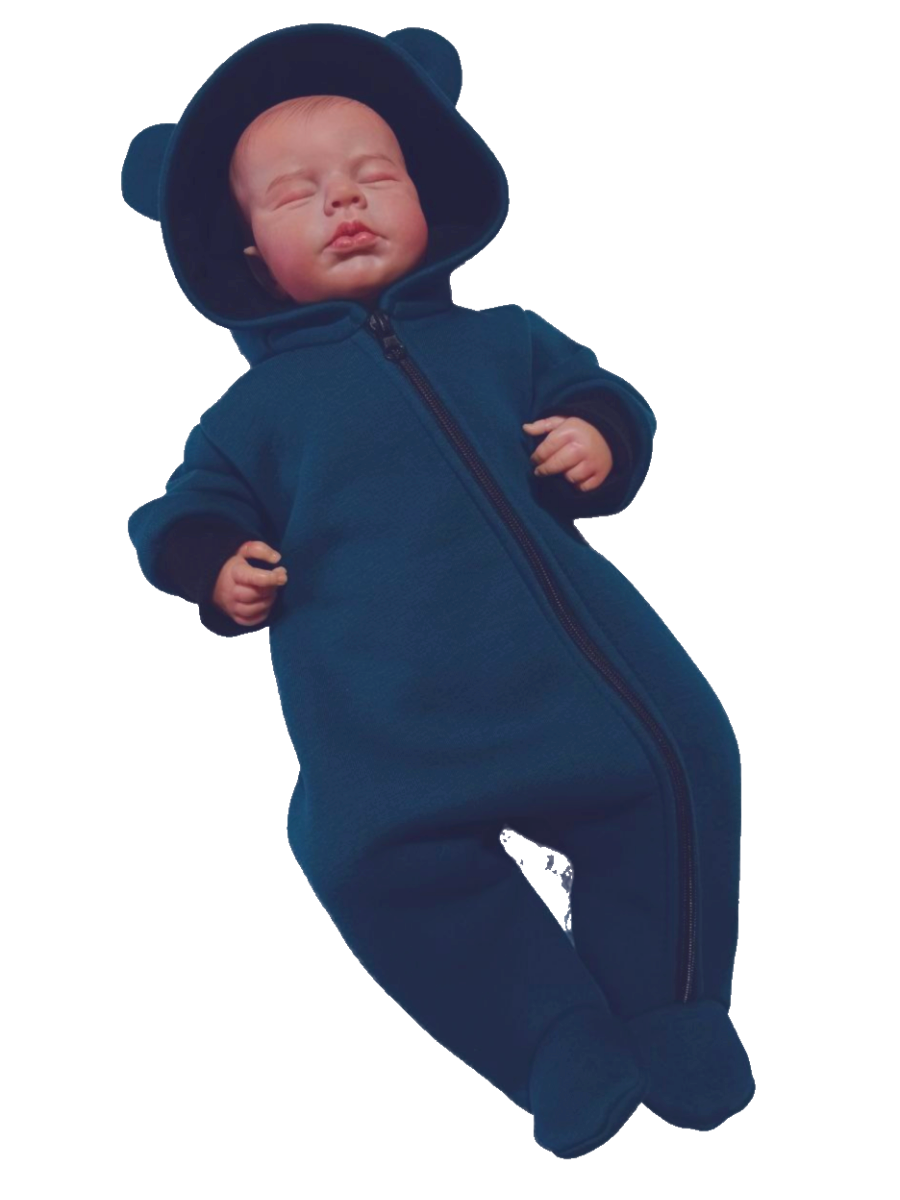 Комбинезон с закрытыми ножками, с капюшоном на подкладке, на молнии по всей длине и до конца одной ножки.