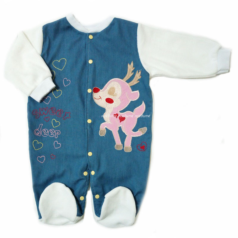 Комбинезон с закрытыми ножками, без воротничка, с длинными рукавами на манжетах, спереди и между ножек на кнопочках. Комбинезон сзади белый велюровый, спереди из джинса и украшен оригинальным рисунком.
