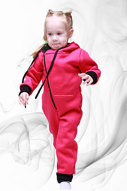 Комбинезон с капюшоном на подкладке, с открытыми ножками, рукавчики на манжете, спереди на косой молнии.