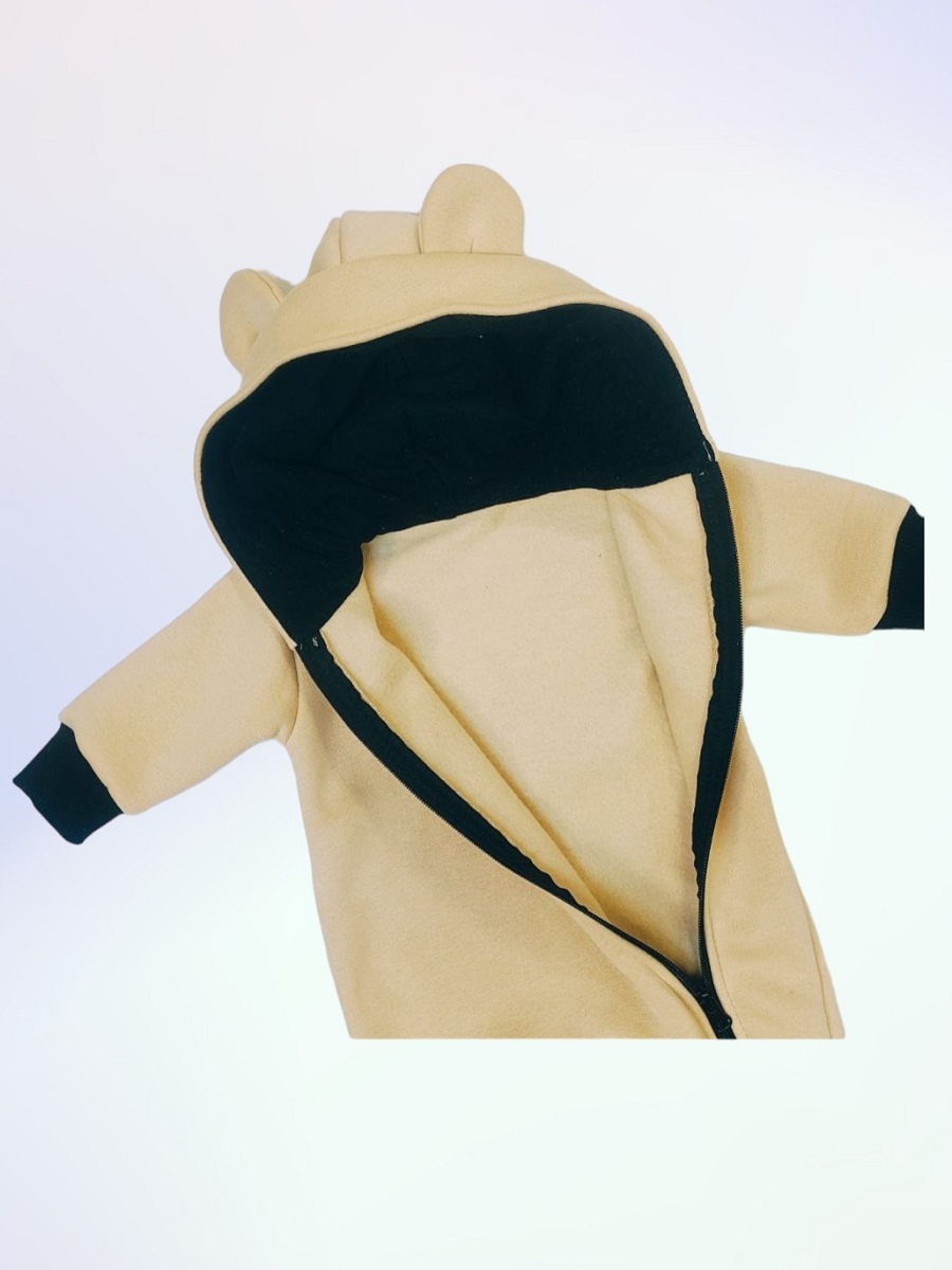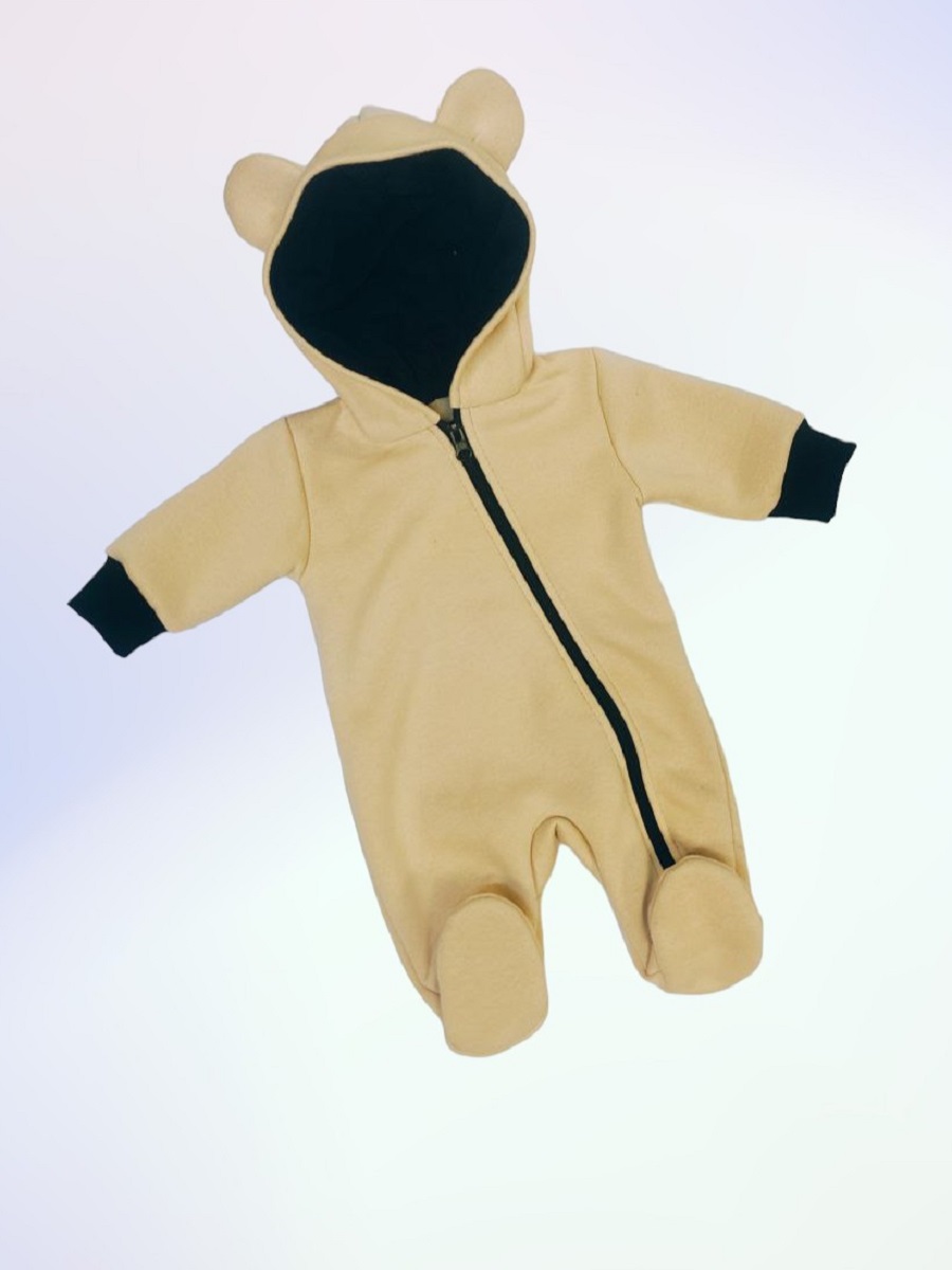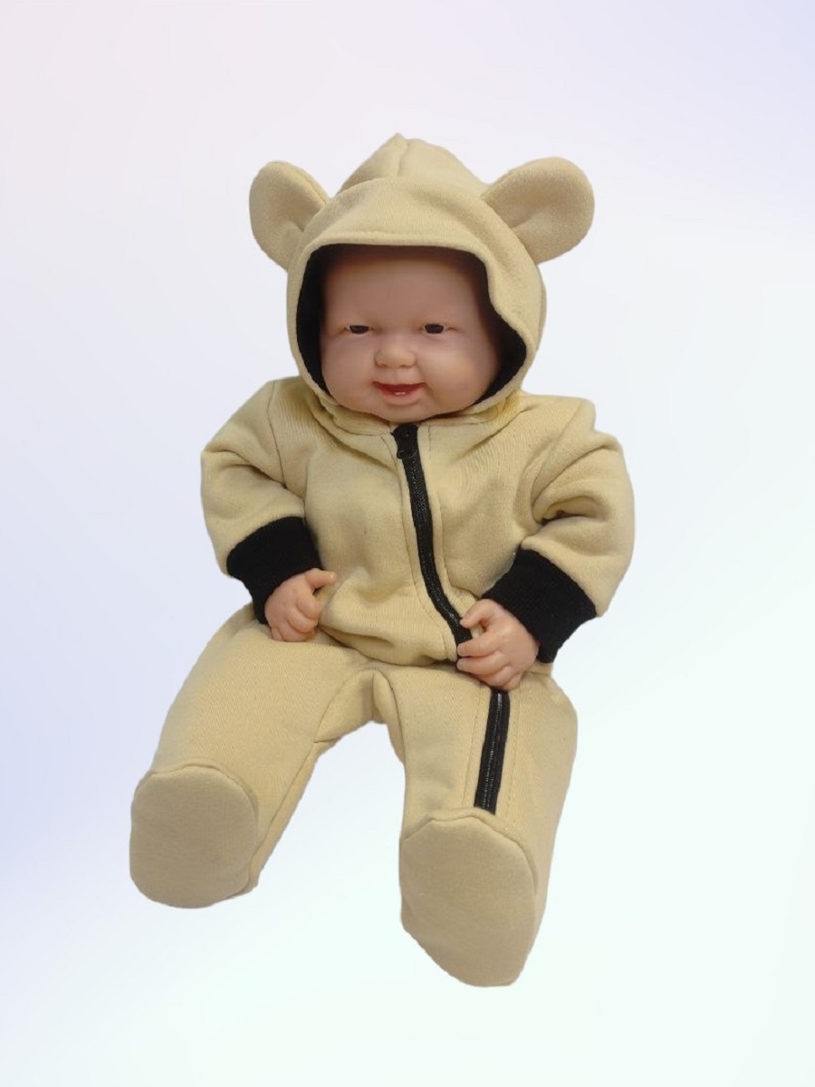 Комбинезон выполнен из футера двухнитки с начёсом. Спереди косая молния, капюшон на подкладке. У комбинезона закрытые ножки, на рукавах манжеты.